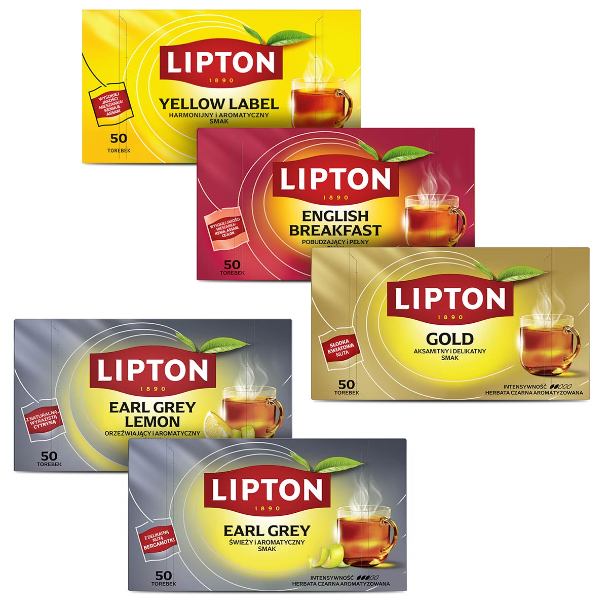 Zestaw herbat czarnych Lipton EARL GREY, EARL GREY LEMON, GOLD, ENGLISH BREAKFAST, YELLOW LABEL 5×50 torebek